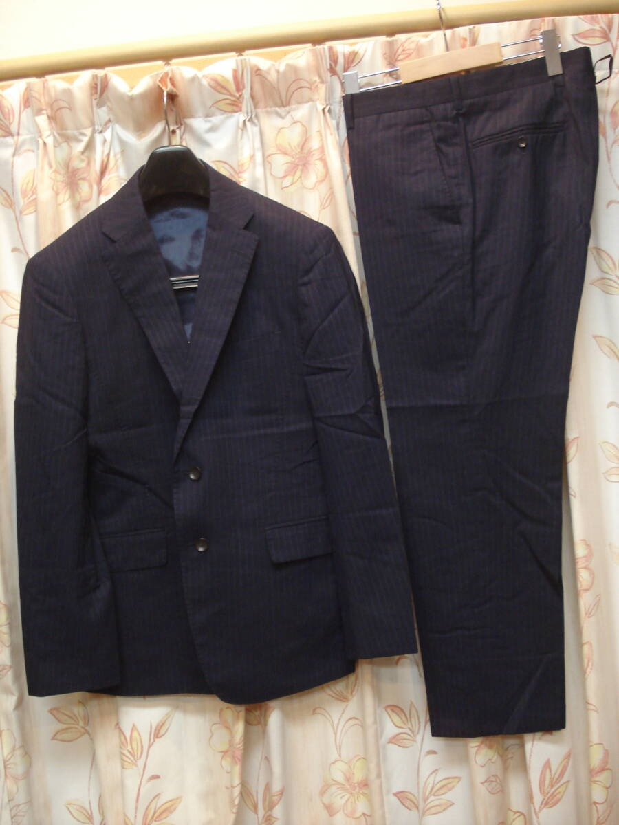 > 送料無料!美品!秋冬もの!PERSONS FOR MEN パーソンズ!AB4サイズ!ウェスト87cm!濃紺色薄い同系統色ストライプ柄入!シングルスーツ