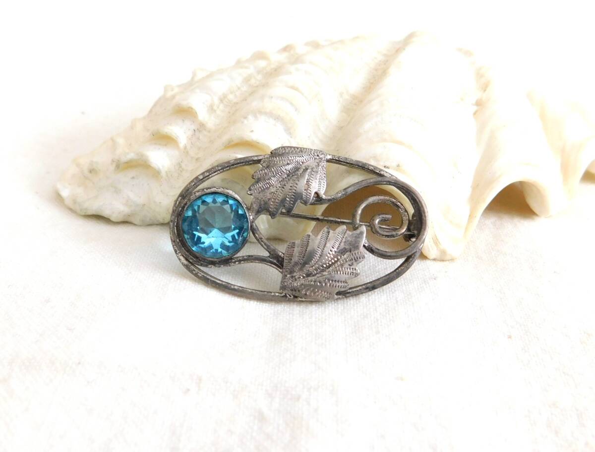 - ヴィンテージブローチ アクアマリン色ガラスラインストーンの飾られたシルバートーンの古いブローチ ビンテージ