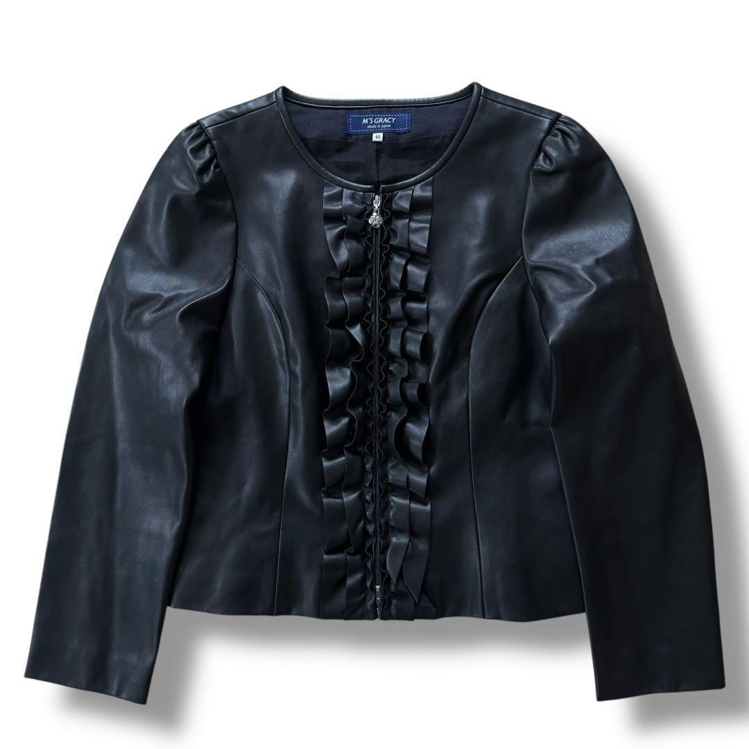 - 【定価4.2万/美品】M'S GRACY エムズグレイシー フェイクレザー フリル ノーカラー ジャケット 花柄ジップ 黒 ブラック 40 Lサイズ 近現行