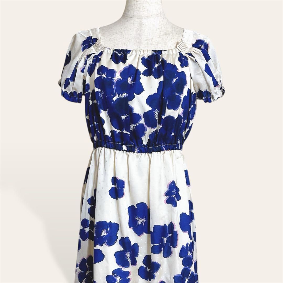 - 美品 スープ ブルー フラワー 花柄 スクエアネック ロングフレアワンピース 9・M レディース ウェストゴム 大人可愛い 涼し気 きれいめ
