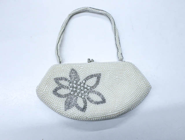 - 《京都一輝堂》【着物】 アンティーク 和装小物 ビーズバッグ 花柄 パール 24W-3219