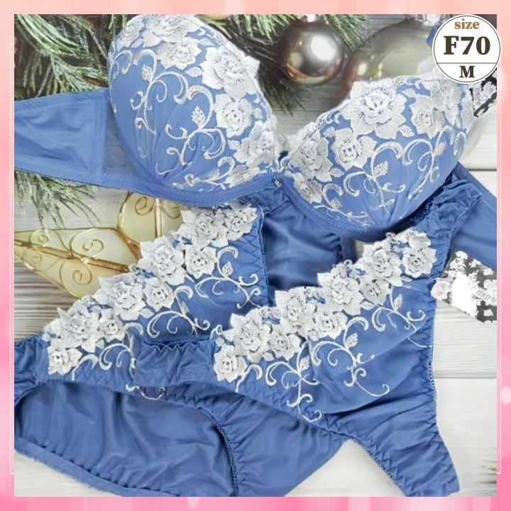 > Zf7014◆新品 ブラショーツセット【F70/M】下着 フルバック&Tバックセット セクシー Wパッド 盛胸 ホワイトローズ 青