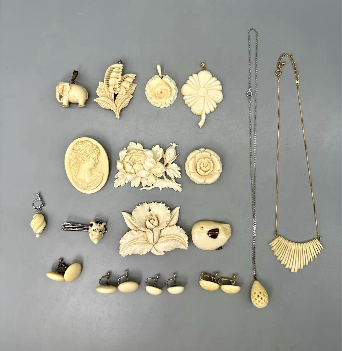 - 17点セット 天然素材 ネックレス イヤリング ブローチ ペンダントまとめて 彫刻お花 象 工芸品アクセサリー ヴィンテージ ブレスレット