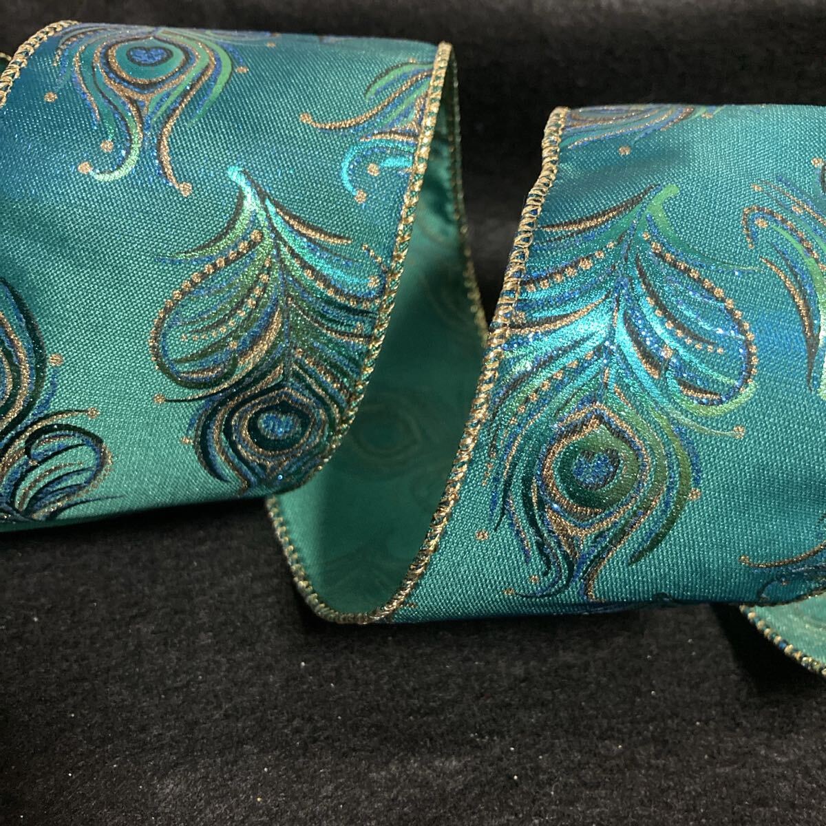 - L.リボン切り売り 約6.3cm幅 1.5m ターコイズ色の孔雀羽模様リボン ピーコック リボン