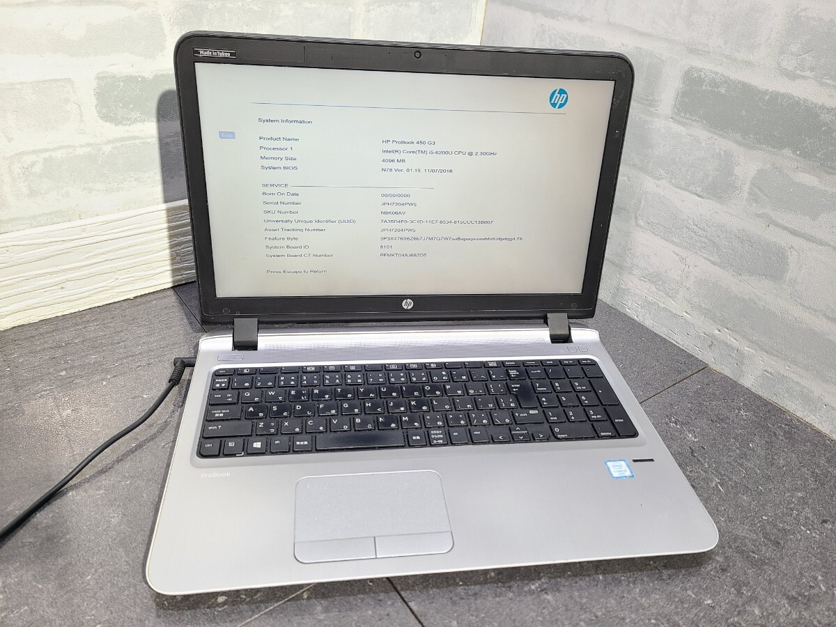 > 【現状品】管2U58 hp ProBook 450 G3 CPU core i5-6200U Bios起動OK HDD無し、メモリー4GB、バッテリー有り