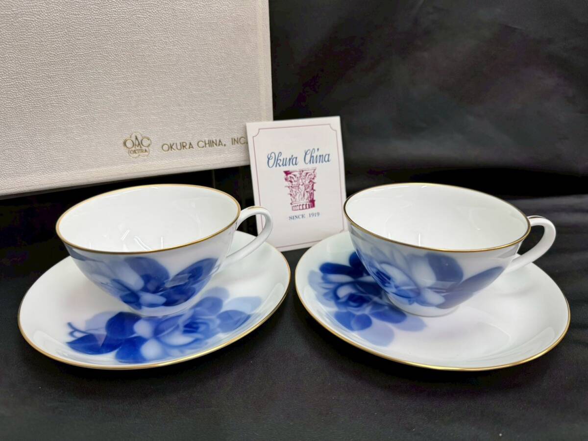 > K1010D【美品】大倉陶園 ブルーローズ カップ ソーサー 2客 ペア 箱付 陶器 食器 コーヒーカップ ティーカップ キッチン 花柄 青 洋風