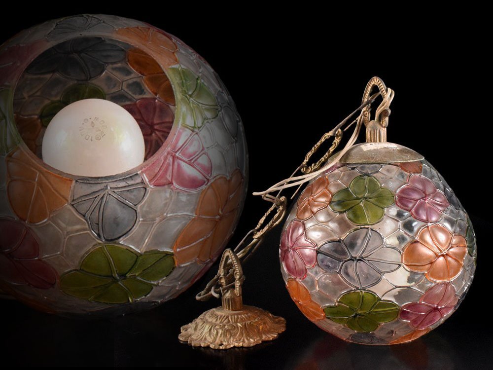 - 【雲】昭和レトロ 花柄 ガラスシェード ペンダントライト 17.5×17.5×23.5㎝ 古美術品(吊下げ 照明 電笠 ランプ)AY6201 CTDk
