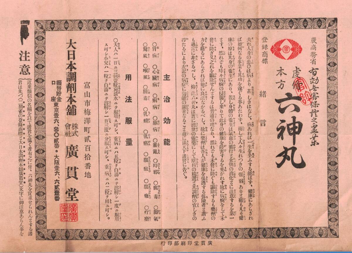 - 登録商標六神丸 農商務省有効無害保證之霊薬 胃病・心臓病・喉風・脚気・腫毒等 富山市梅澤町大日本調剤本舗株式会社廣貫堂広告チラシ