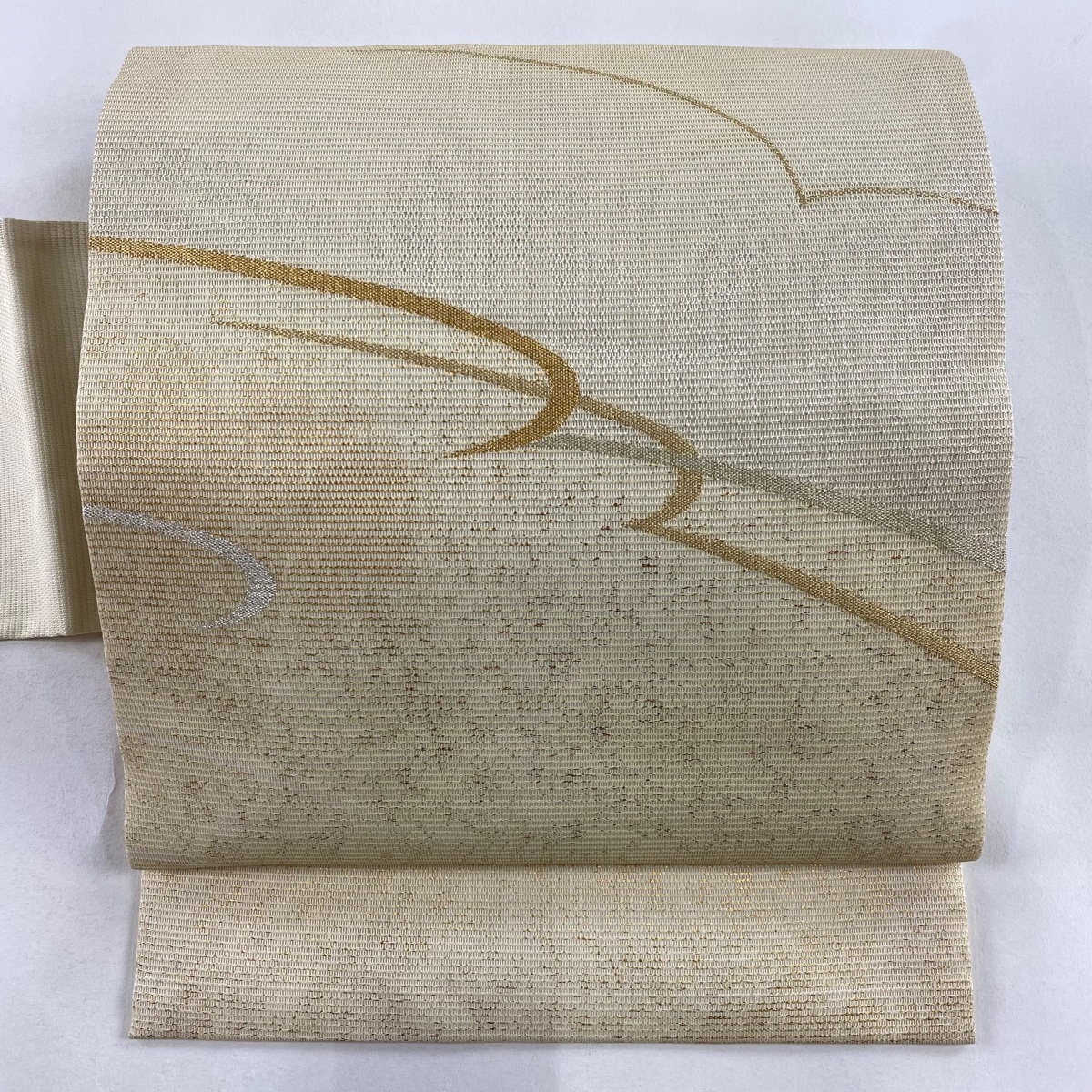- 【美品】 名古屋帯 秀品 夏帯 絽 幾何学模様 箔 金糸 ベージュ 正絹 【中古】