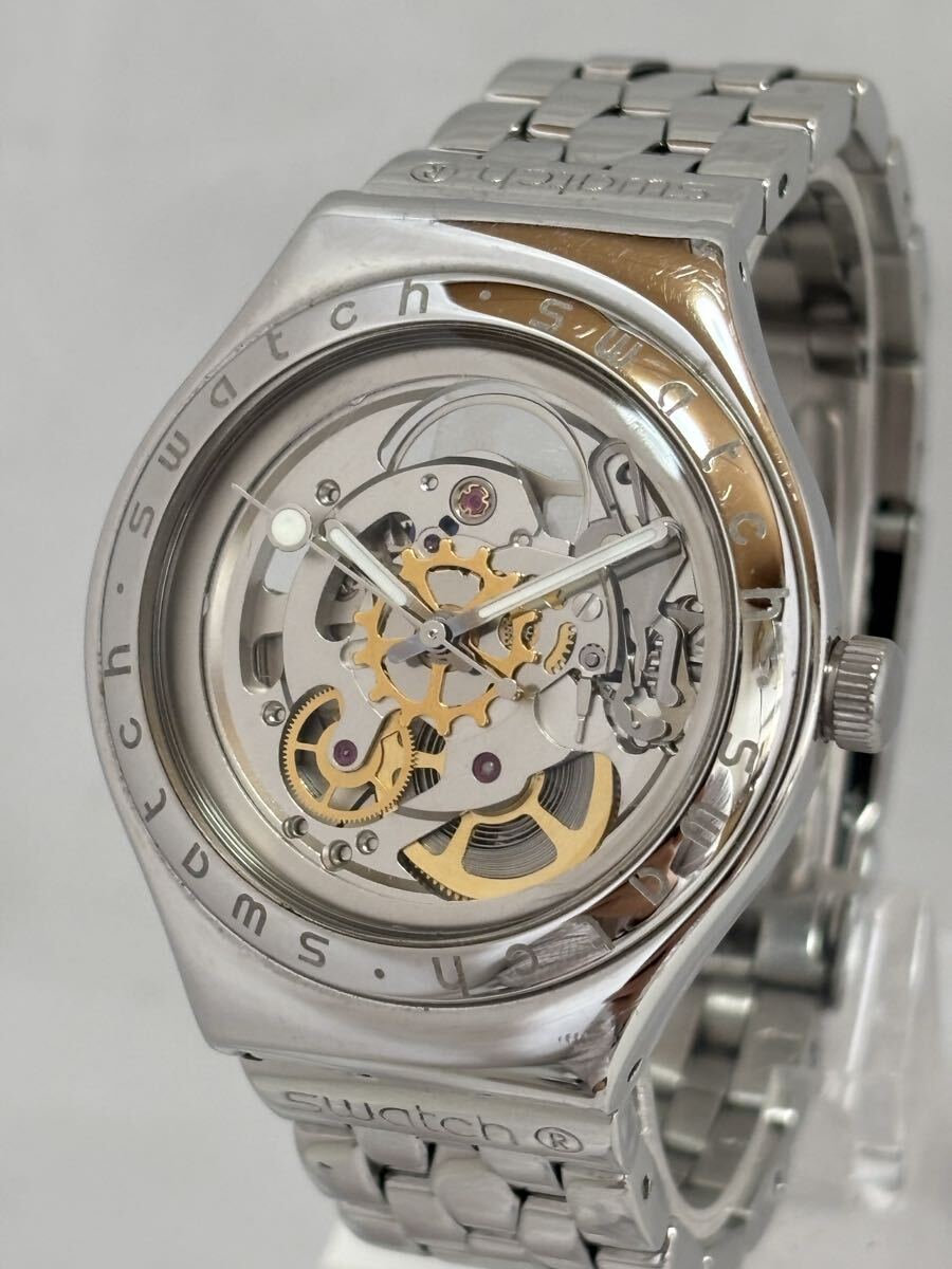 > 【228-21】1円〜【稼働品】swatch スウォッチ スケルトン 自動巻き 純正ベルト 21石 シルバー メンズ 同梱不可