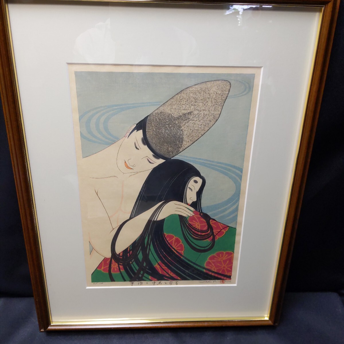 - 瀧秀水 画・彫・摺 伝統創作版画 源氏物語 「宇治と中君と匂宮」 木版画 7/120 額装 直筆サイン 40.1×27.4cm 額 65.4×50.2cm 863