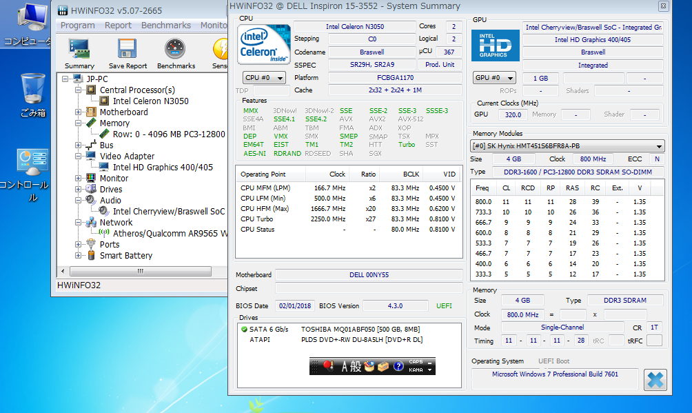 - Windows 7,10 OS選択可 15.6” 薄型 DELL Inspiron 15 3000 3552 ★ Celeron N3050/メモリ4GB/500GB/DVD/無線/カメラ/リカバリ作成/1628