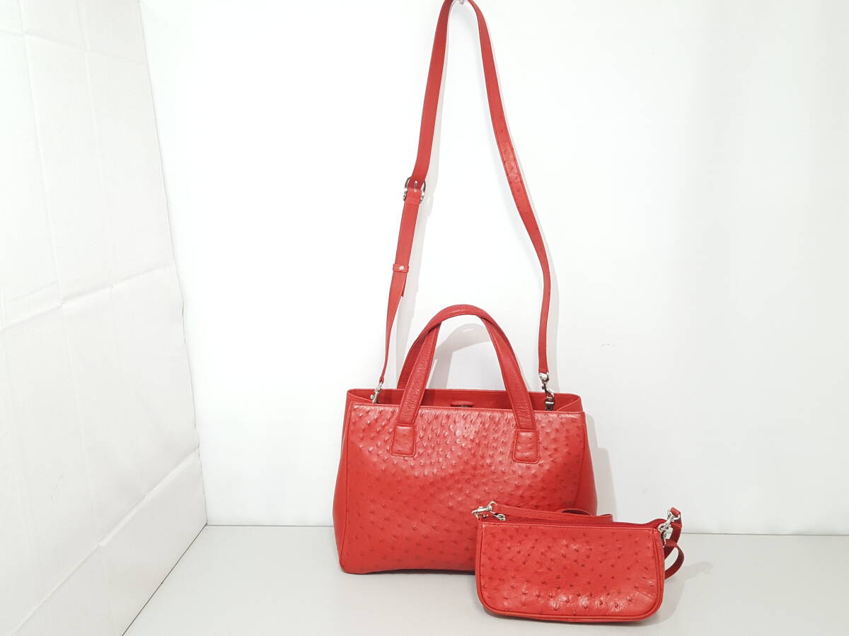 - 【美品】オーストリッチ 2WAYバッグ 2点セット/レッド/ハンド&ショルダー/ミニショルダー/ダチョウ/駝鳥/本革レザー/04KM100904-10
