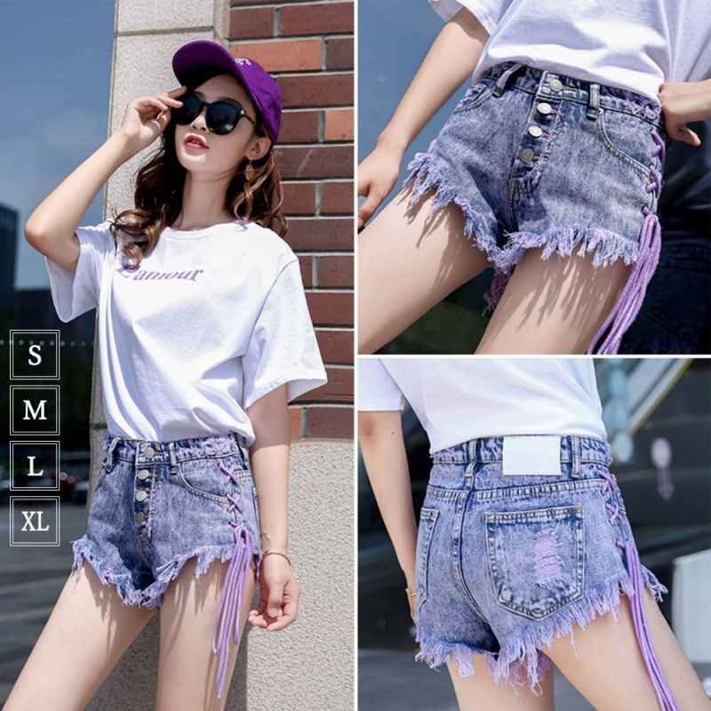 - ダメージ デニム ショートパンツ レースアップ ジーンズ クラッシュ 美脚 M サックスブルー