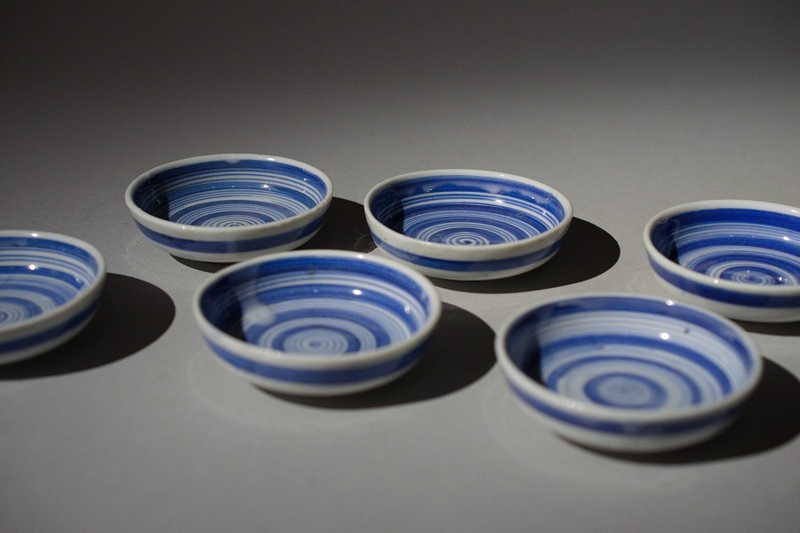 幕末から明治にかけての瀬戸染付輪線文小皿の六客組です。伊万里とはまた違ったとろりとした肌と染付の質感が面白いです。六客いずれも無傷で、それぞれにわずかな違いがあり、手作りのよさを感じます。わずかに深みを持たせてあるので、珍味や薬味にはもちろん、平盃にも使えそうです。BANKOミュージアムで催された「輪線」展の図録に、同手が掲載されておりました。参考としてアップいたします。