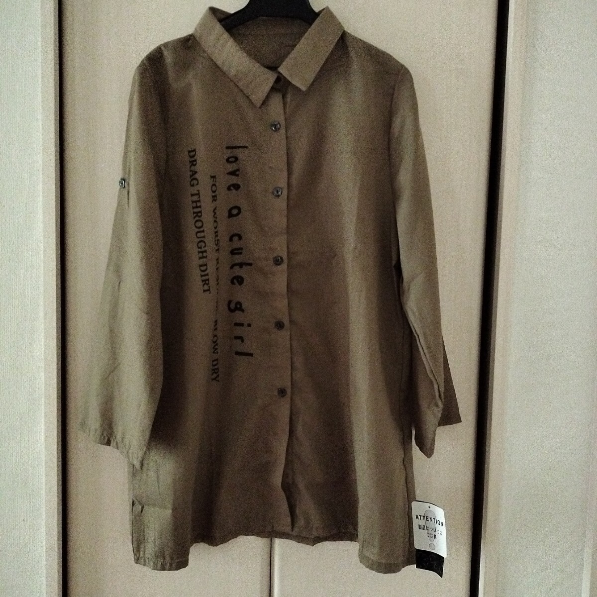 > 新品タグ付【M~Lサイズ】hanahana 関西ファッション連合 レディース 長袖シャツ ロング丈 チュニック丈 トップス カーキ ロゴ ④