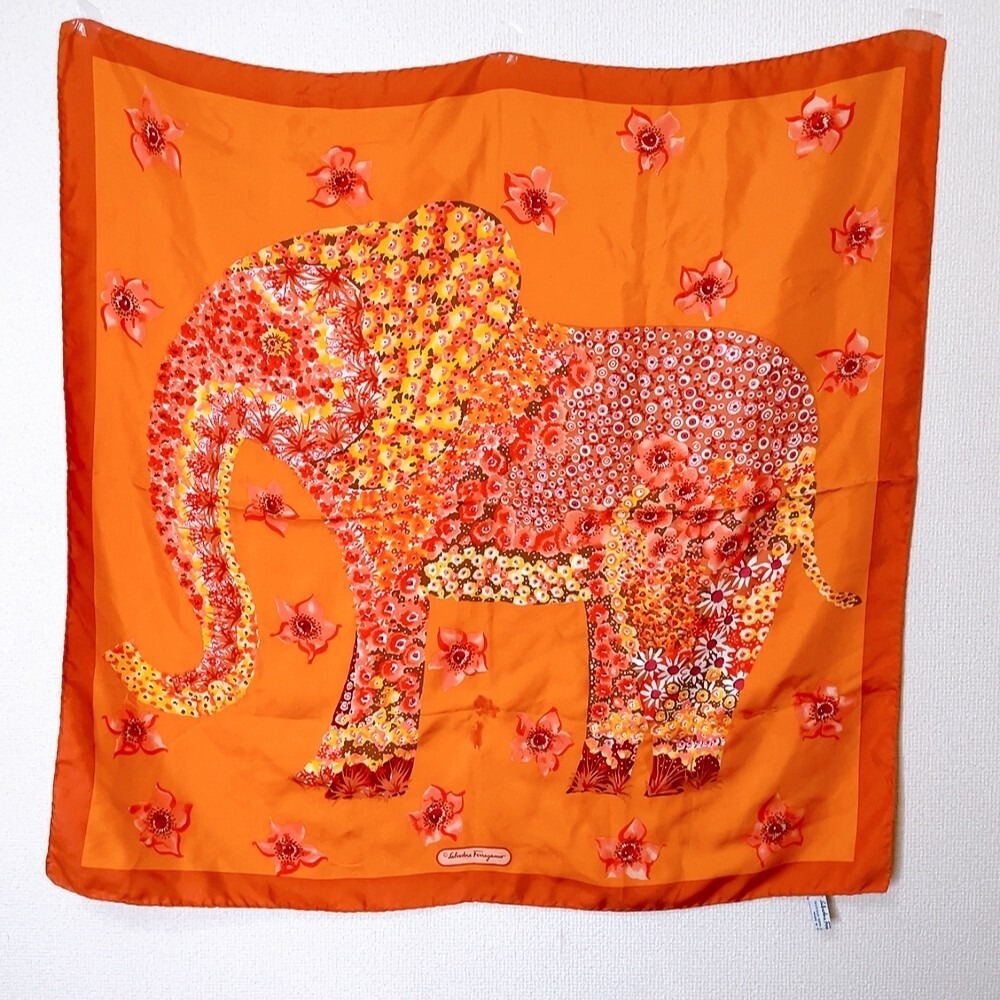 - フェラガモ スカーフ ショール エレファント 像 花柄 100% シルク イタリア製 オレンジ