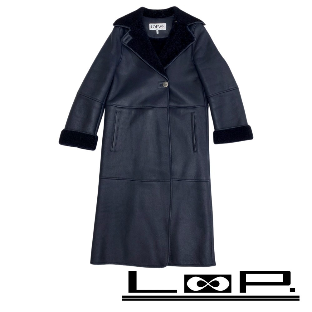 > ■新同■ ロエベ ロングコート ムートン 裏ボア テーラードカラー リアルファー レザー ラム ネイビー #32 【452284】7