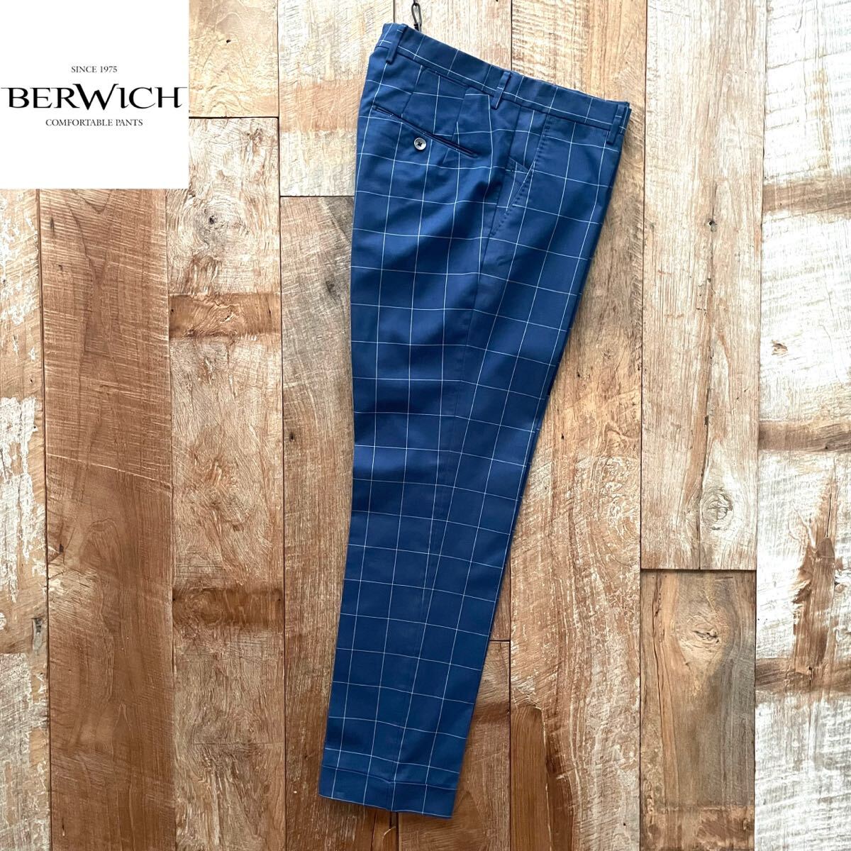 - 【極美品】BERWICH ベルウィッチ チェック柄 テーパード コットン スラックス パンツ 48 ネイビー BEAMSF取扱