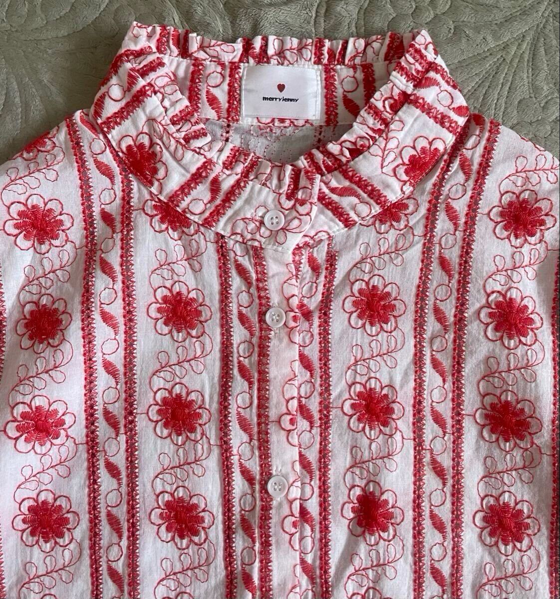- merry jenny 刺繍 ブラウス ハイネック フリル スタンドカラー 九分袖 白 赤 綿100% コットン メリージェニー F