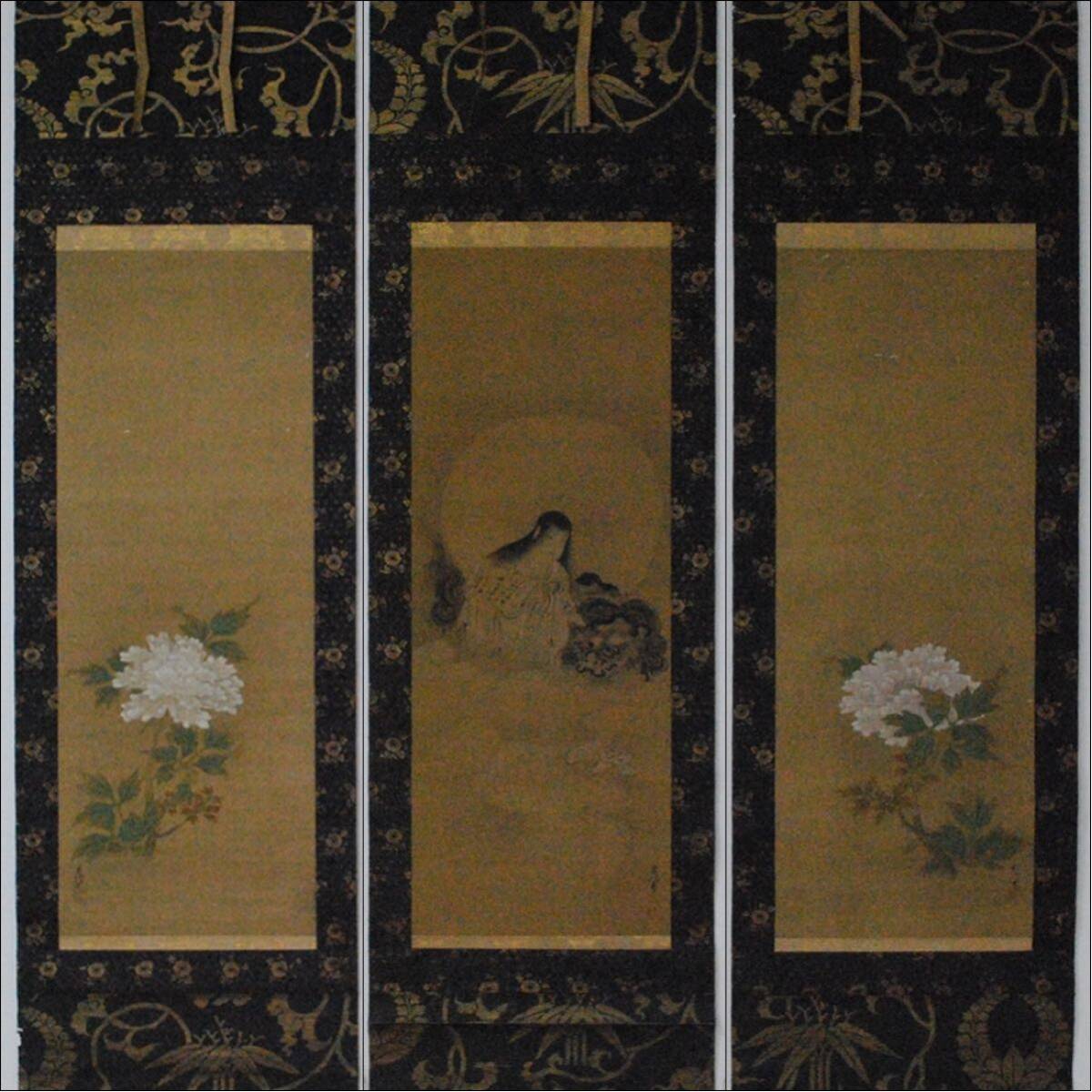 - 真作 絹本 狩野周信 彩色 文殊菩薩 牡丹図 三幅對 古画 仏画 唐画 仏教宗教画 掛軸