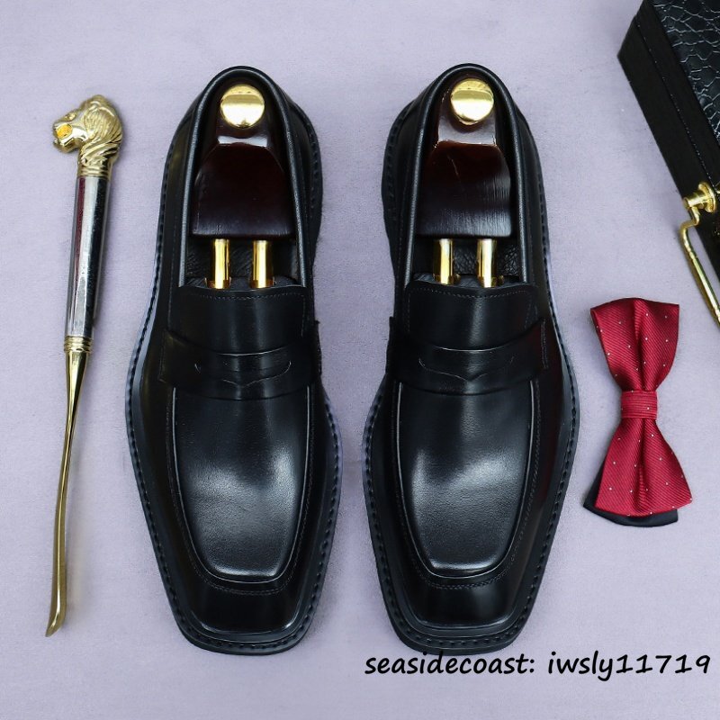 - 定価11万超■極希少 ビジネスシューズ メンズ 本革 職人手塗り上げ 厚底 ローファー レザーシューズ 高級牛革 革靴 紳士靴 ブラック 26.5cm