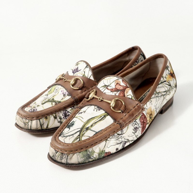 - GS3937〇イタリア製 GUCCI グッチ*ホースビット フローラ 花柄 ローファー*37 1/2(24cm相当)*靴*オフホワイト×ブラウン系