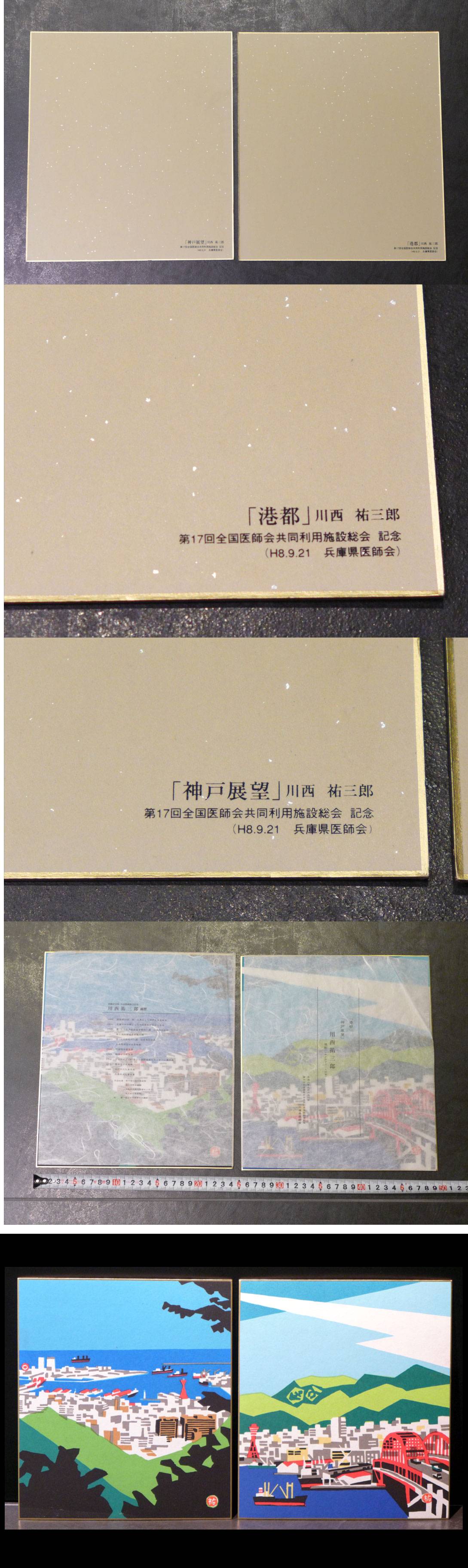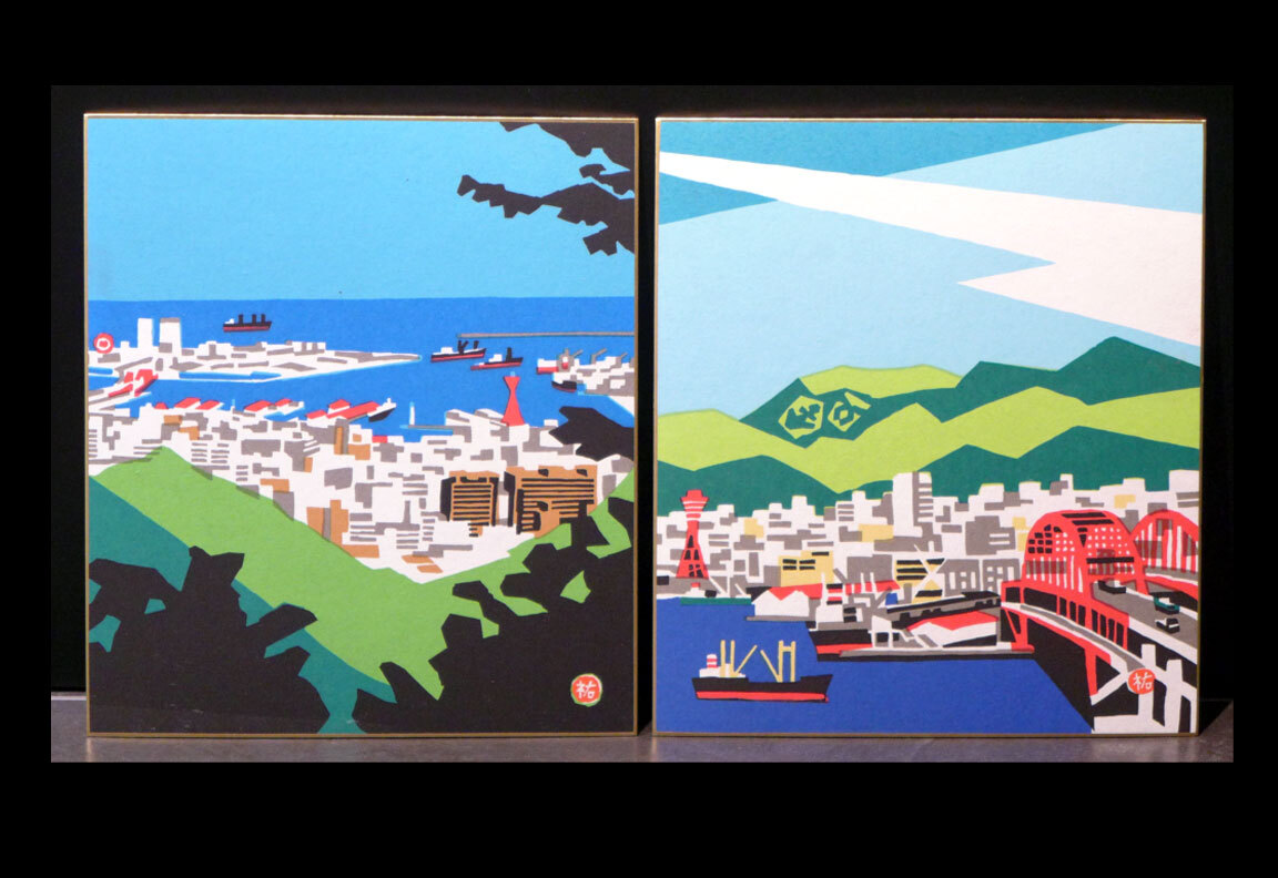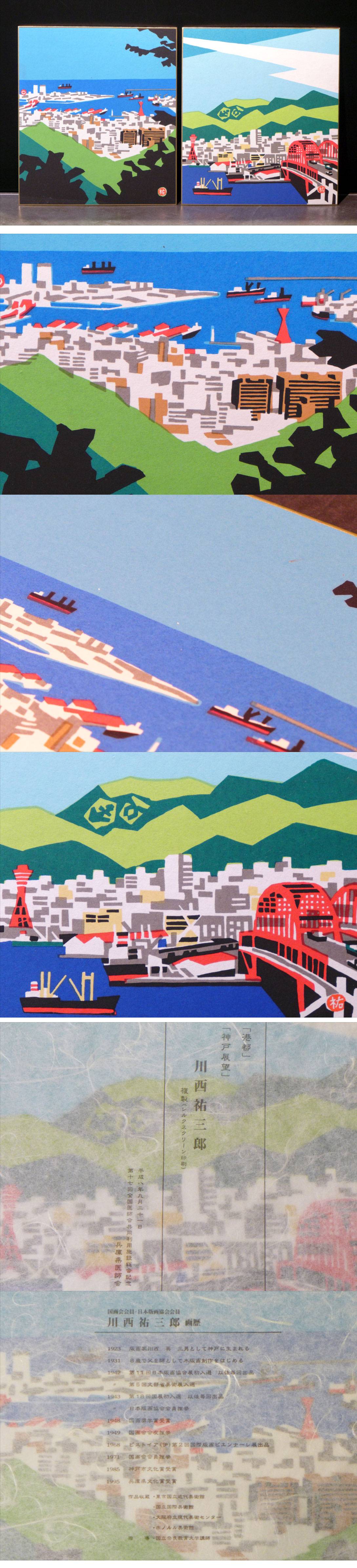 - 版画家 川西祐三郎 『神戸展望』『港都』 彩色木版画 色紙2点セット 検/川西英息子風景画