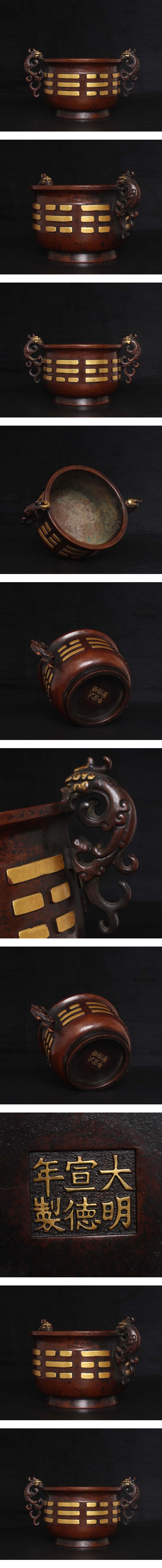 > ◆珍蔵◆中国古美術 大明宣徳年製款 古銅製 紫銅 塗金 蟠龍双耳炉 細密細工造 置物 擺件 古賞物 骨董品 時代物 A13