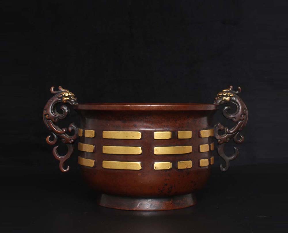 - ◆珍蔵◆中国古美術 大明宣徳年製款 古銅製 紫銅 塗金 蟠龍双耳炉 細密細工造 置物 擺件 古賞物 骨董品 時代物 A13