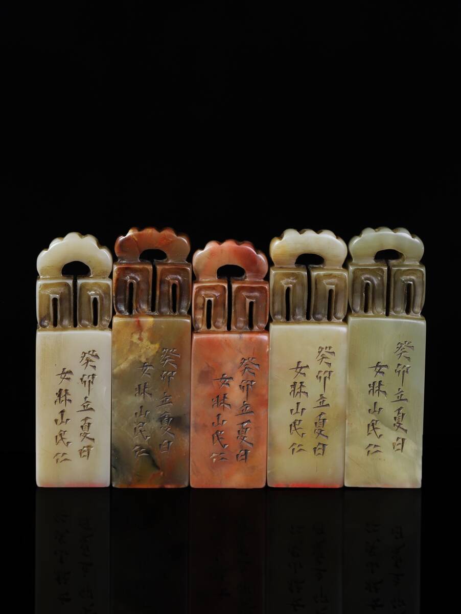 - ◆珍蔵◆中国古美術 清時代 古寿山石 彫り愽意印章 一組5点 箱付 細密細工造 置物 古賞物 骨董品 時代物 A17
