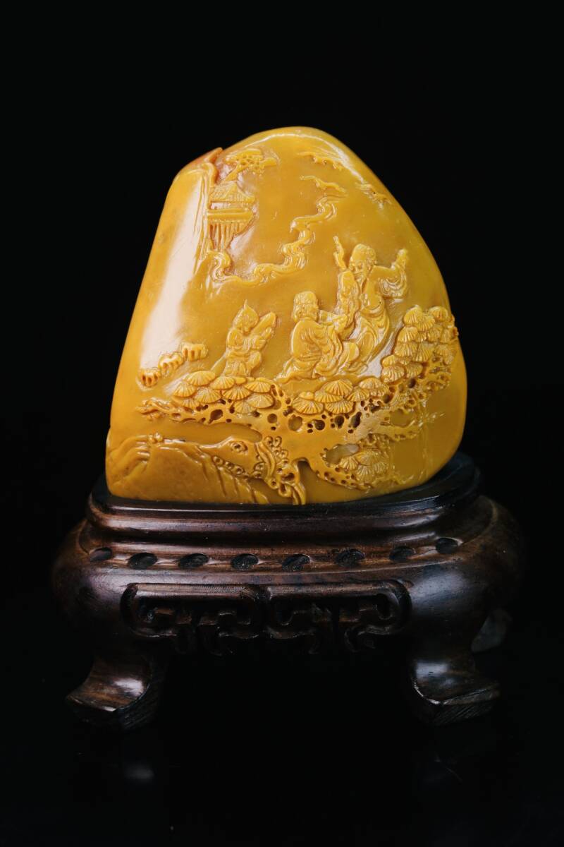 > ◆珍蔵◆中国古美術 清時代 古寿山石 田黄石彫り山水人物故事図 置物 箱付 精品 細密細工造 擺件 古賞物 骨董品 時代物 A68