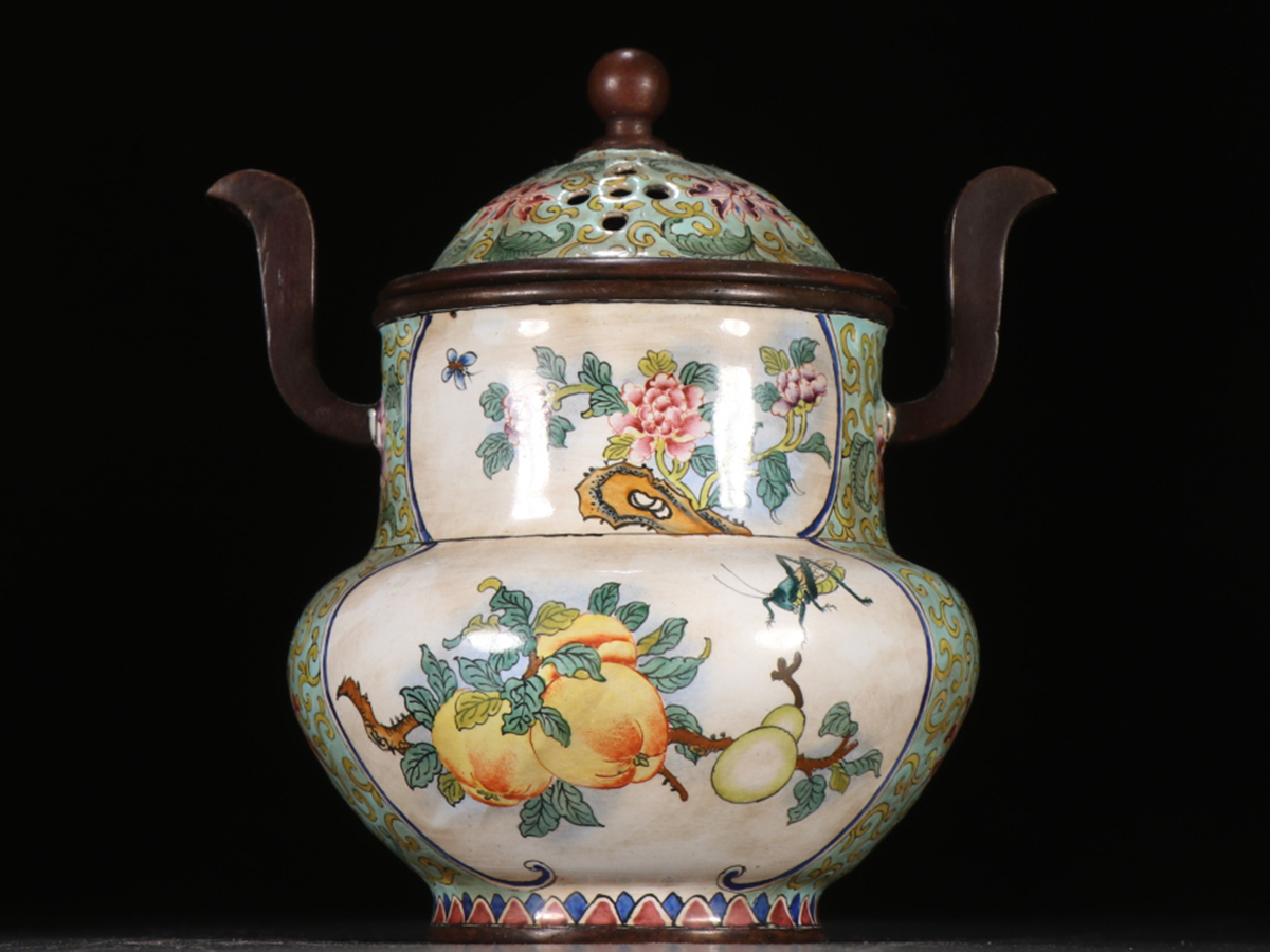 - ▽鴻▽清時代 乾隆年製 銅胎 琺瑯彩花果紋双耳香薫炉 時代物 中国古美術 骨董品