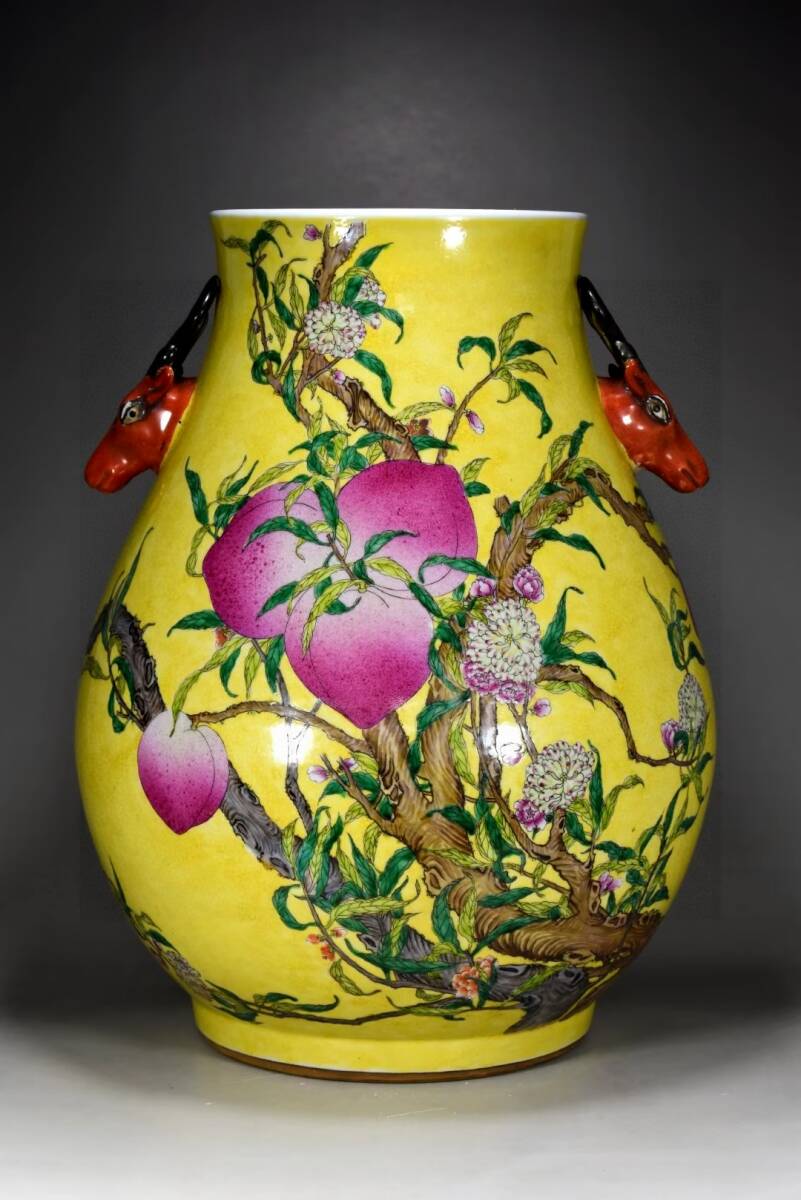 > 【仁】『清・乾隆年製款・古陶瓷品・粉彩・壽桃紋・鹿頭尊・陶藝』極細工 古董品 中国古玩 古美術 古美味 時代物 旧家蔵出