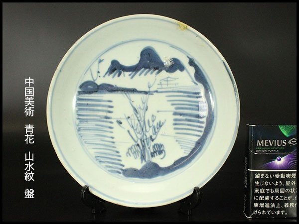 > 【銀閣】中国美術 青花 山水紋 盤 φ18.5cm 旧家蔵出 送料無料(XA413)