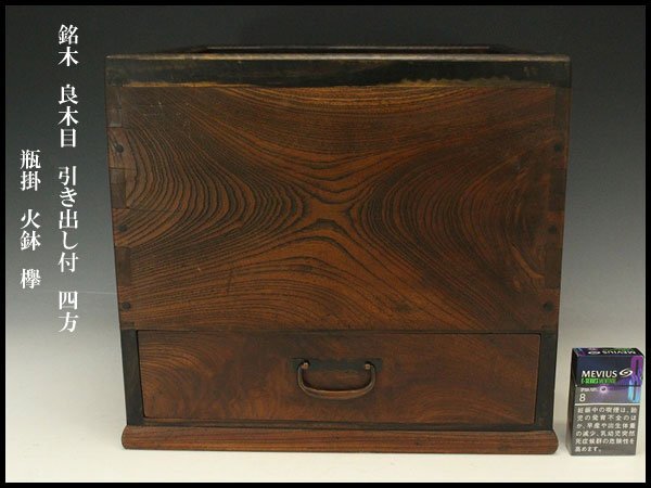 - 【銀閣】銘木 良木目 引き出し付 四方 瓶掛 火鉢 36cm×36cm 欅 旧家蔵出 送料無料(ZE290)