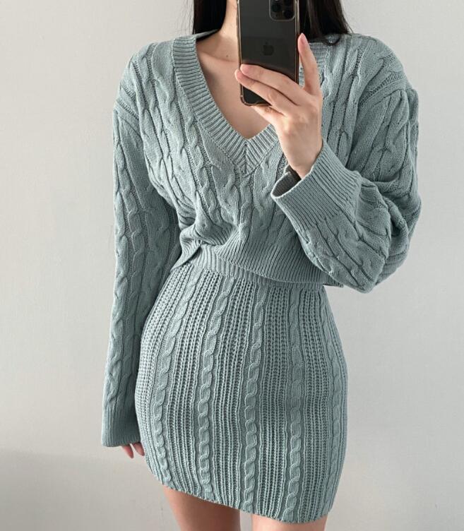 - M1017 スカートスーツ● 着心地抜群 20代30代40代 ●ニット素材 ケーブル編み グリーン