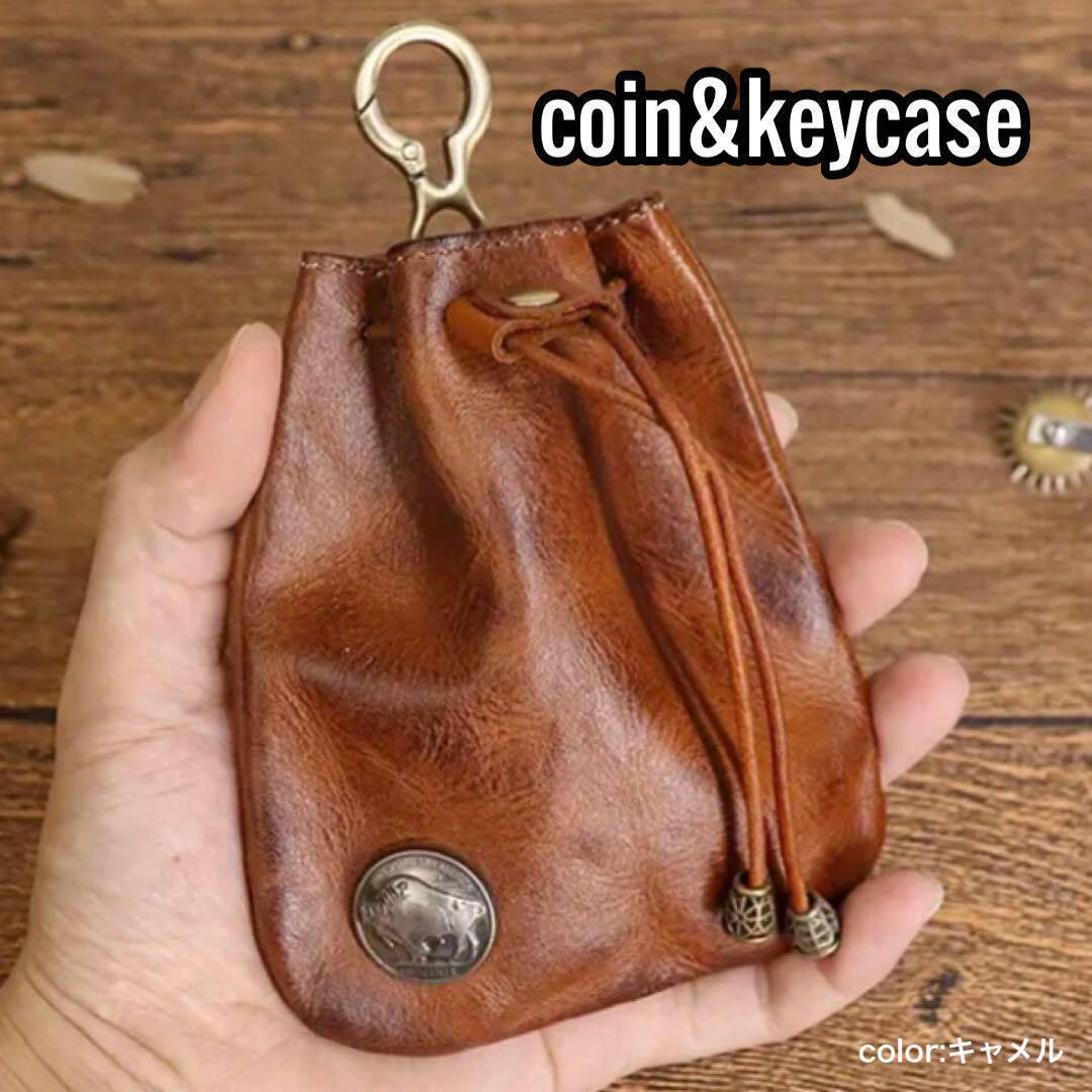 - 本革 コインケース キーケース牛革 レザー ヴィンテージ アメカジ キャメル