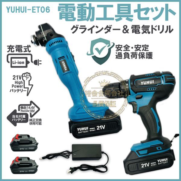 > ★送料無料・30日間保証付き★充電式電動グラインダーインパクトレンチ 電気ドリル 2点セット 21Vバッテリー2個付き マキタ バッテリ対応