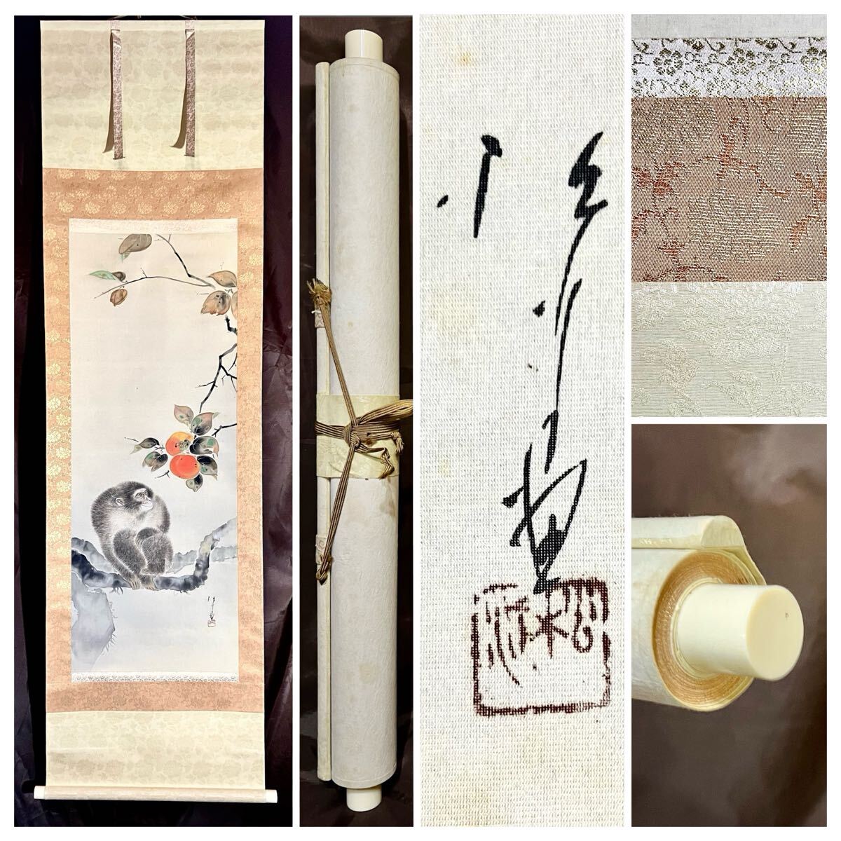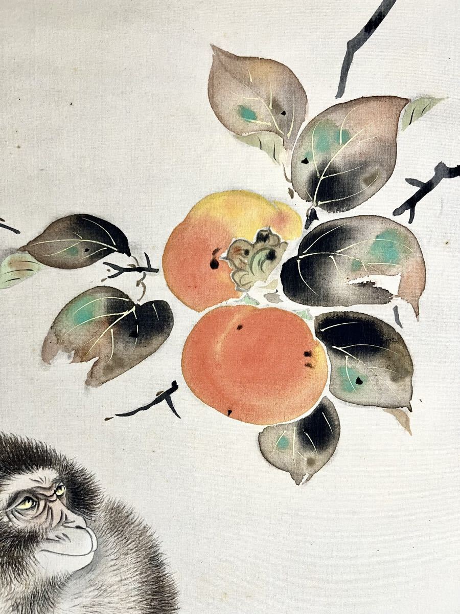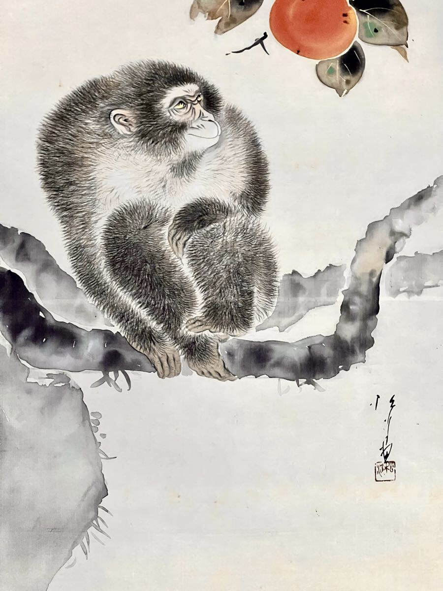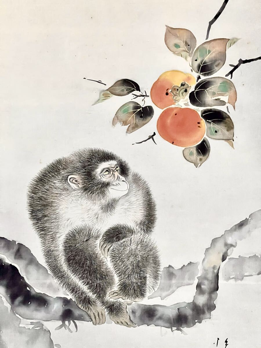 - 【模写】【S8】平田松堂「柿に猿」絹本 金泥 秋景 花鳥図 鳥獣 絵画 掛軸 明治-昭和時代の日本画家 東京の人 師: 川合玉堂