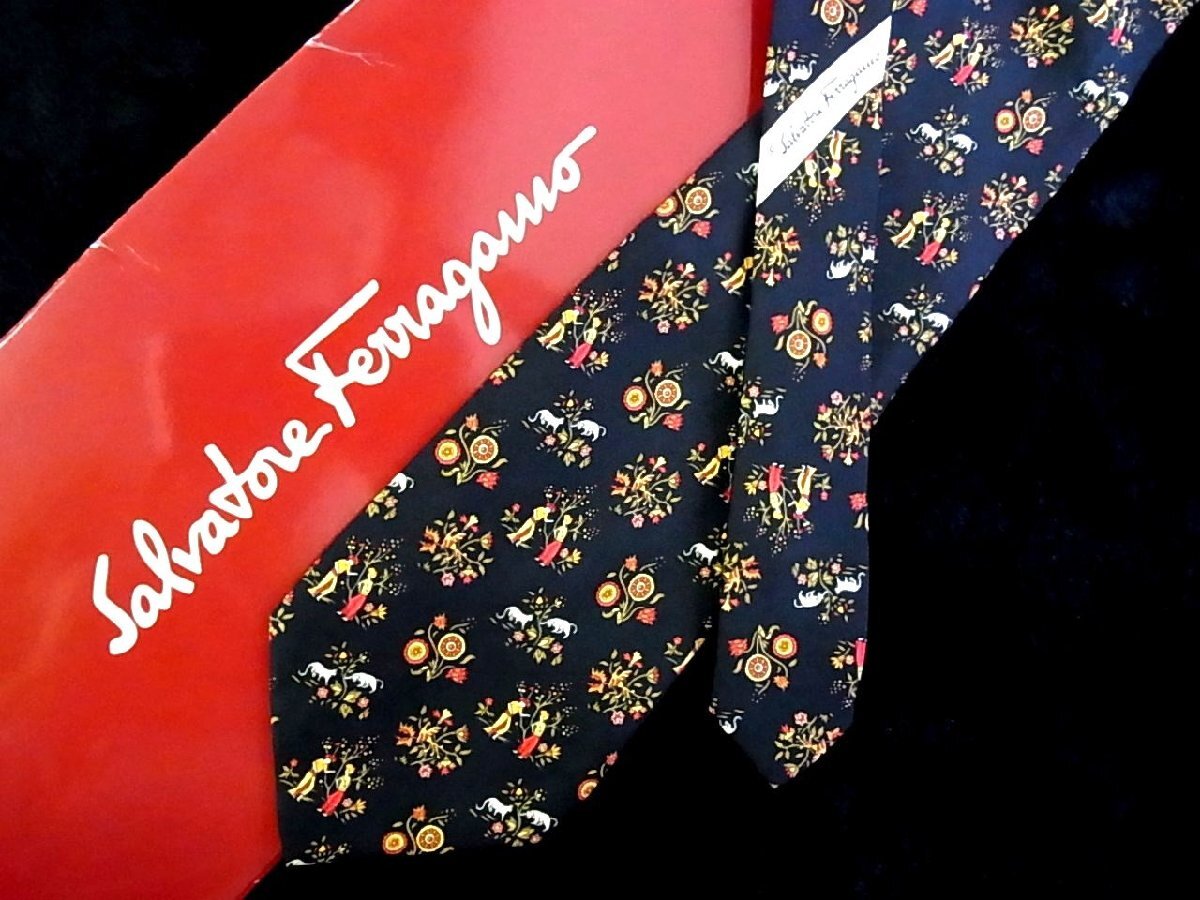 - ♪今週の特売980円~♪4131♪良品【FERRAGAMO】フェラガモ【人 猫 ねこ 動物 花 植物 柄】ネクタイ♪