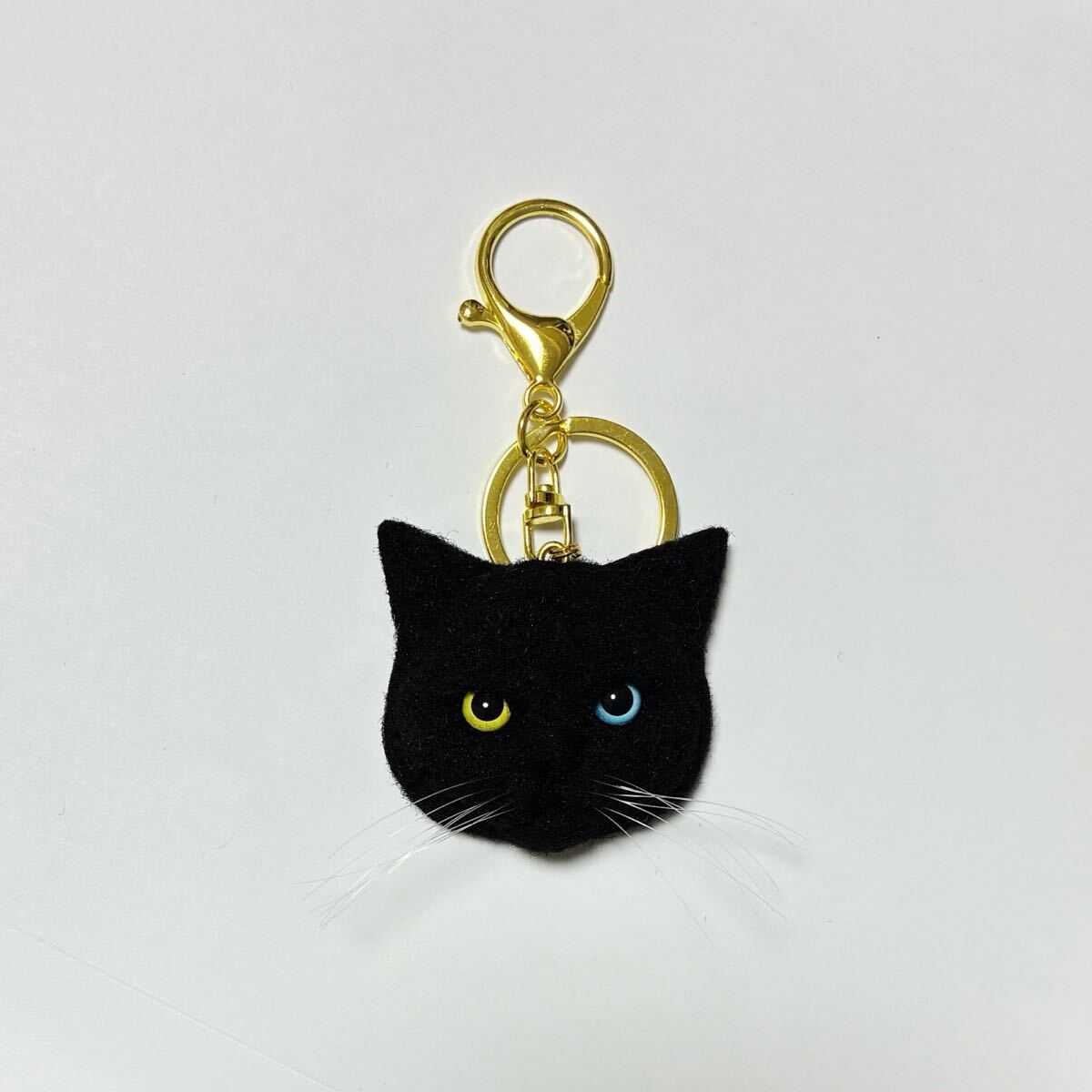 - 羊毛フェルト 猫キーホルダー 黒猫 オッドアイ