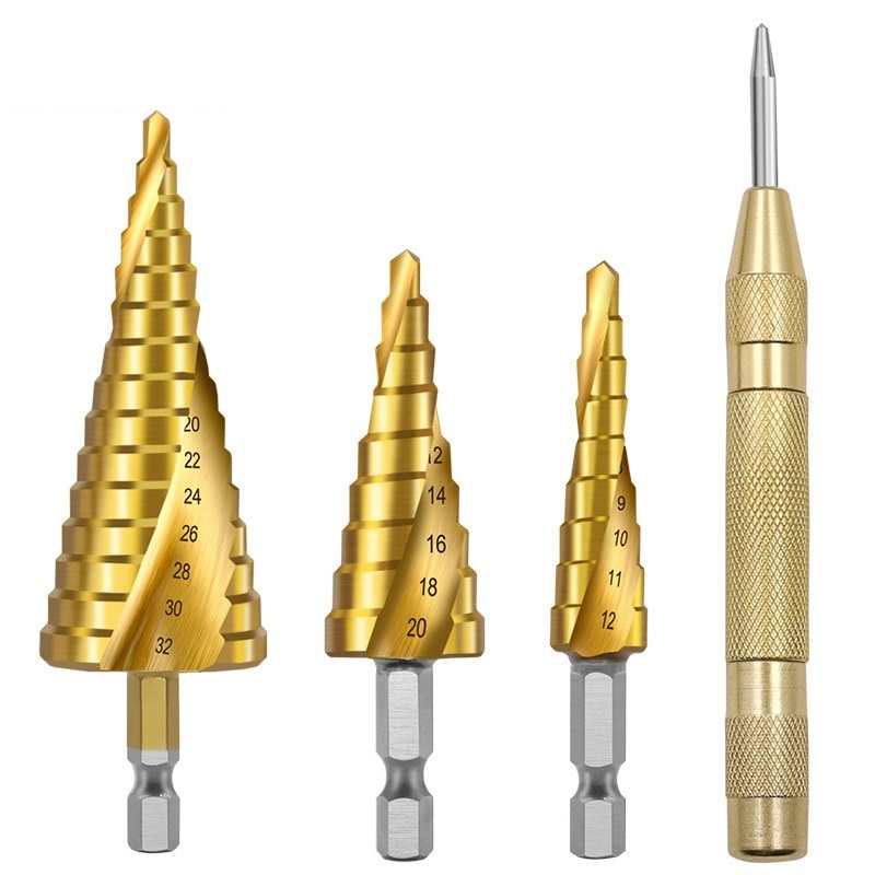 > ステップドリル3本&オートセンターポンチセット☆ インパクト ドライバー六角軸 HSS鋼