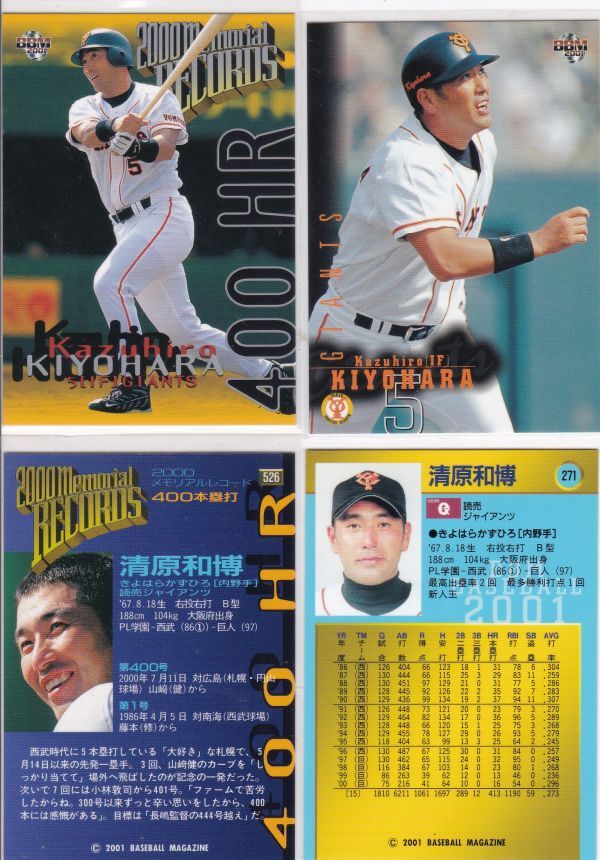 - ●2001BBM【清原 和博】サブ版:400本塁打 526+通常版 271:巨人 R