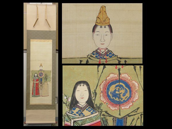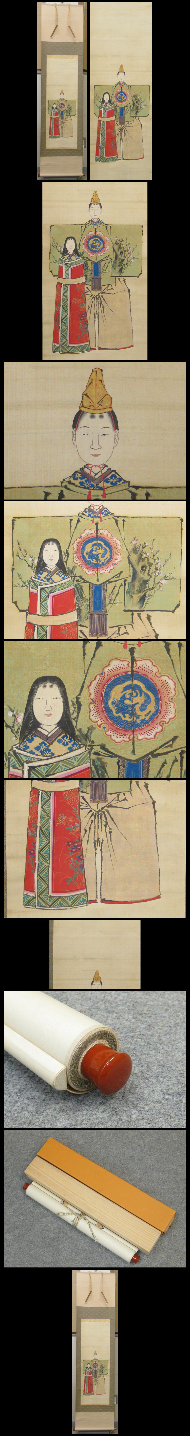 - 【心庵】掛軸 古い 絹本 お雛様図/肉筆 無落款 付箱 A573