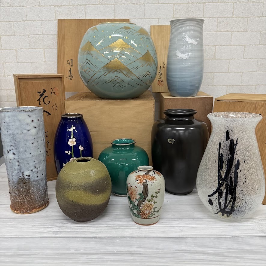 - 【B505-10】常骨焼の陶器 谷川仁作 紙面壺 九谷焼 吉右衛門 花瓶 花台付 など 9点 まとめ売り