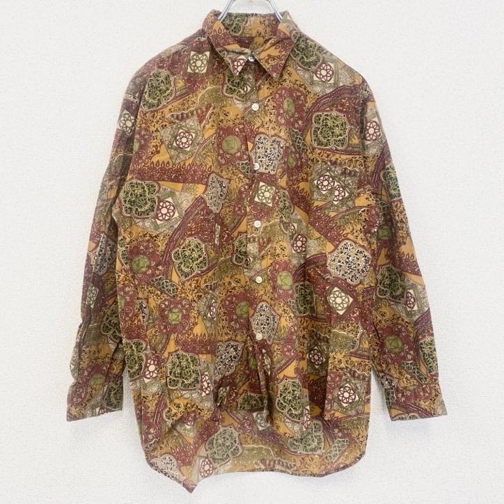 > 古着 used 長袖プリント総柄シャツ レトロデザイン ボタニカル エスニック 幾何学模様 花 絨毯 Mサイズ