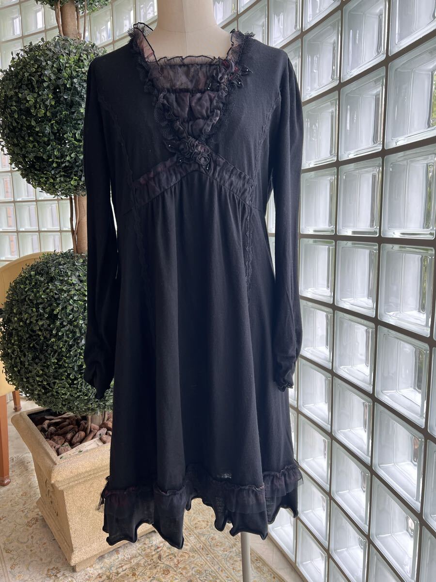 - 人 ZIN ジン★黒 ジャージー レース フリル ワンピース 40 美品♪f