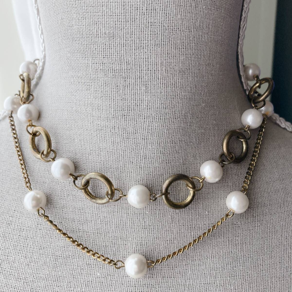 > ヴィンテージネックレス くすみゴールド チェーン パール ショート ダブル 左右カニカン☆Vintage jewelry accessoriesF0328