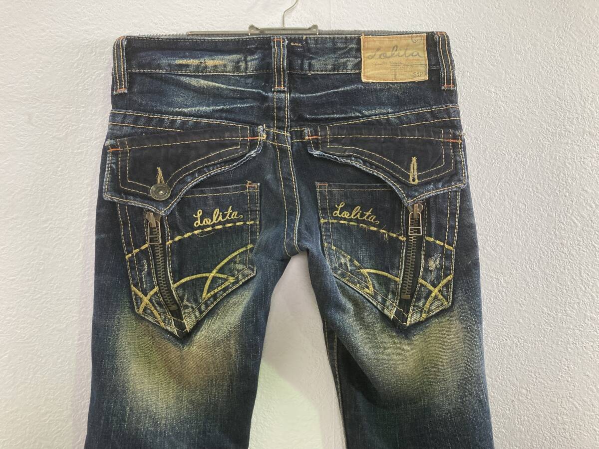 > ★LOLITA JEANS ロリータジーンズ★ バックロゴ刺繍 W26 M相当 フラップポケット 濃紺 総柄 パンツ デニム ジーンズ 激安 格安